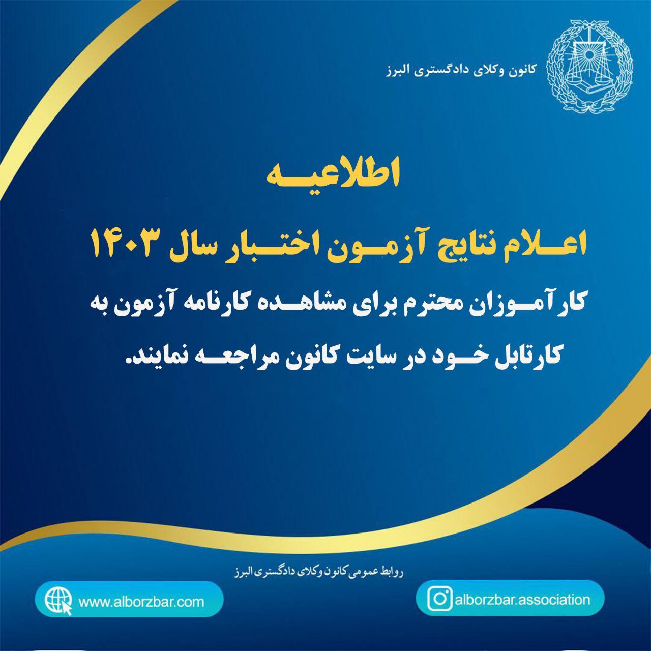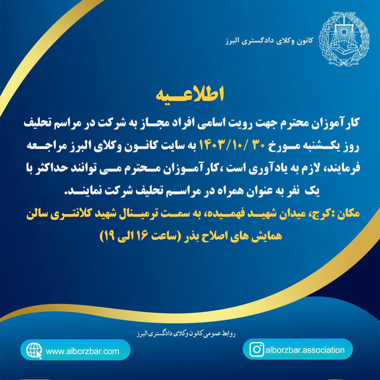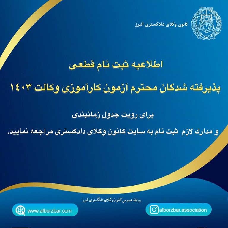 🔹اطلاعیه ثبت نام قطعى پذیرفته شدگان محترم آزمون کارآموزی وکالت ١٤٠٣ کانون وکلای دادگستری استان البرز